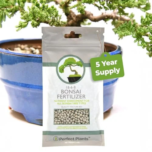 Bonsai Fertilizer Pellets by Perfect Plants provides a nutrient-rich formula with an 18-6-8 N-P-K ratio. This all-natural, slow-release fertilizer requires only one application every six months. It offers constant nutrition with essential elements like Iron and Potassium, promoting better overall growth.