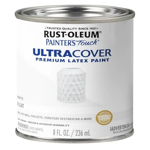 Rust-Oleum 1990502 Painter’s Touch Latex Paint offers a flat white finish in a quart size. Ideal for larger projects, it covers up to 120 sq ft. The low odor, water-based acrylic formula resists chips and provides excellent adhesion for various surfaces.