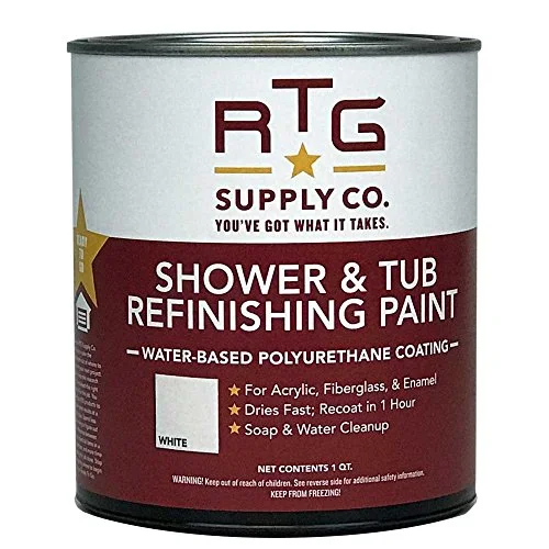 RTG Shower & Tub Refinishing Paint in White offers a low-sheen finish that revitalizes fiberglass surfaces. It dries quickly, allowing recoating in just one hour. This paint is easy to apply with a brush or roller and is suitable for acrylic and enamel surfaces. It covers 80-100 sq ft per quart.