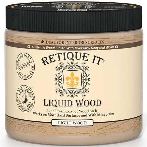 Retique It New and Improved Formula Liquid Wood Coatings is a stainable primer designed for a seamless finish. It features a patented formula with over 60% real wood fibers, providing an authentic wood appearance. This eco-friendly primer requires no sanding and offers a smooth application for deeper grain penetration.