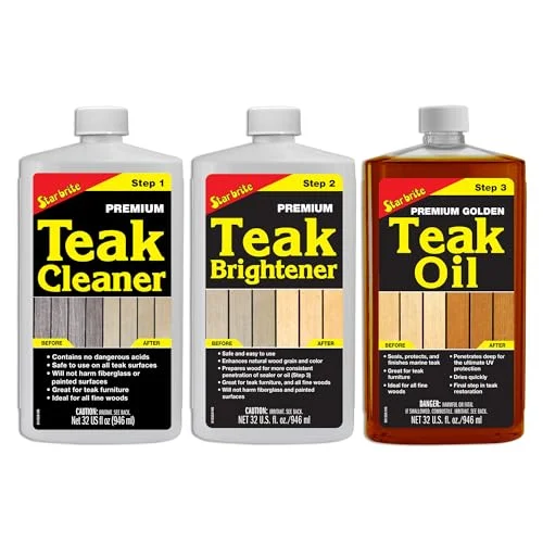 The STAR BRITE Teak Kit is a comprehensive solution for restoring decks, patio furniture, and boats. It includes a teak cleaner that removes weathering, a brightener for enhancing wood grain, and a long-lasting teak oil. This marine-grade kit protects against UV damage and dry rot, ensuring durability.