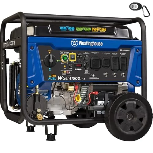 The Westinghouse 11000 Peak Watt Tri-Fuel Inverter Generator combines inverter technology with tri-fuel capabilities. It offers 11,000 peak watts and 9,000 running watts on gasoline, maintaining clean power for sensitive devices. It operates quietly, making it suitable for residential use.