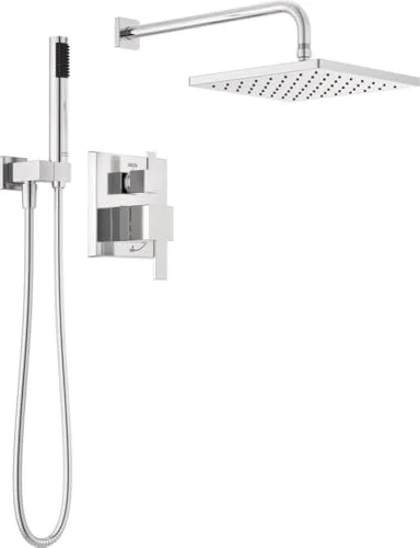 The Delta Modern 14 Series Square Rain Shower System Faucet Set offers a complete shower system with a stylish chrome finish. It features a 10-inch rain shower head, an integrated diverter, and a wall-mounted handheld shower. The Monitor Pressure-Balanced Valve Cartridge maintains consistent water temperature, ensuring a comfortable shower.
