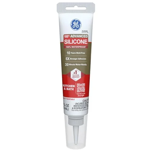 GE Advanced Silicone Caulk for Kitchen & Bathroom in clear offers 100% waterproof protection. This 2.8 fl oz tube features 5X stronger adhesion and is shrink and crack proof. It cures in 30 minutes for quick water readiness, ensuring resilient protection in moisture-prone areas.