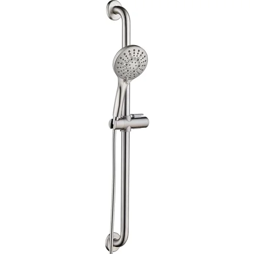 The BRIGHT SHOWERS Slide Bar Shower Set features a robust stainless steel design. It includes an ADA-compliant grab bar, adjustable height for convenience, and a 69-inch hose for flexibility. With nine spray settings, this system is perfect for versatile showering experiences, ensuring comfort and safety for users.