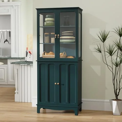 The ARTPOWER 72″ Freestanding Kitchen Pantry showcases a captivating dark teal color. This stylish cabinet features four doors, adjustable shelves, and a sturdy MDF construction. Its glass panels allow for showcasing interior items, making it both functional and aesthetically pleasing, ideal for any modern kitchen.