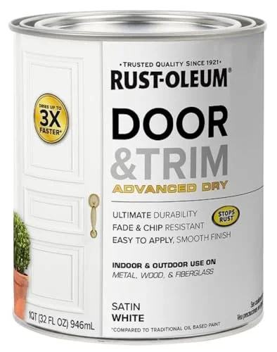 Rust-Oleum 369384 Advanced Dry Door & Trim Paint is ready to use, pre-mixed, and ideal for refreshing metal, wood, or fiberglass surfaces. It features a water-based formula that dries in 45 minutes, three times faster than oil-based options. The durable satin finish offers excellent chip resistance and modern curb appeal.